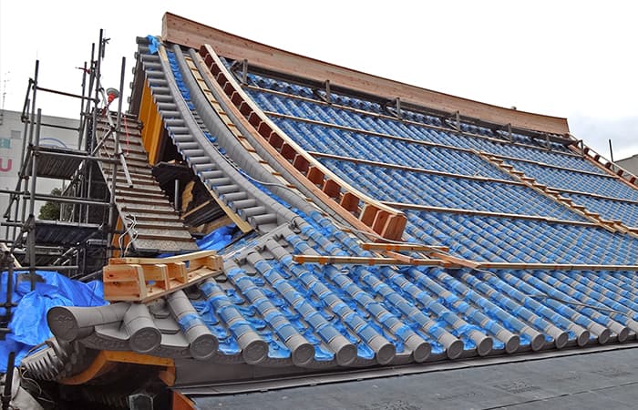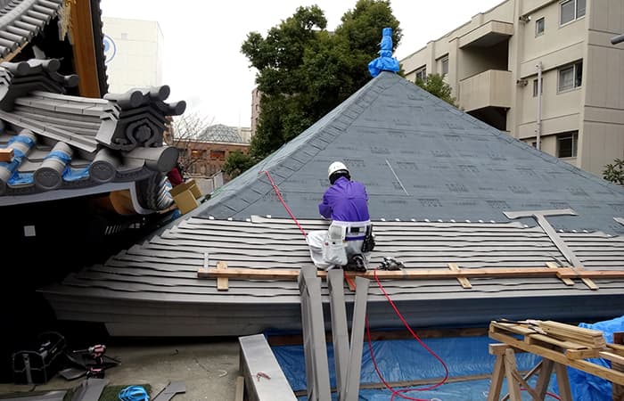 新設した下地の上にチタン瓦「チタン カナメ段付本瓦葺き」を施工。