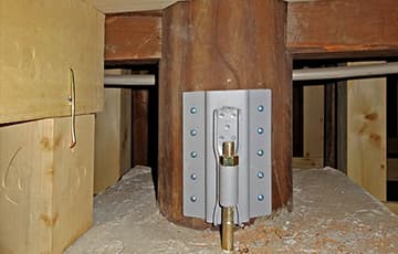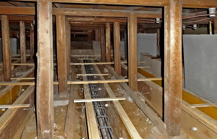 本堂床下の基礎は、新たに鉄筋コンクリート土台を埋設し基礎の安定化ともに、基礎と柱をホールダウンアンカーで接続して地震の際でも柱のズレを防ぎます。