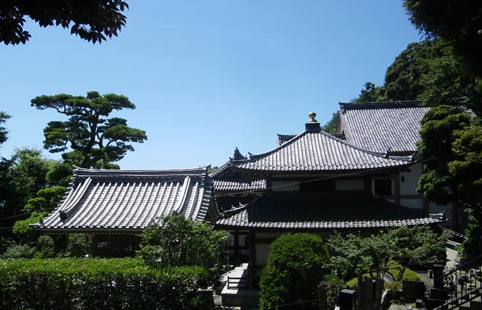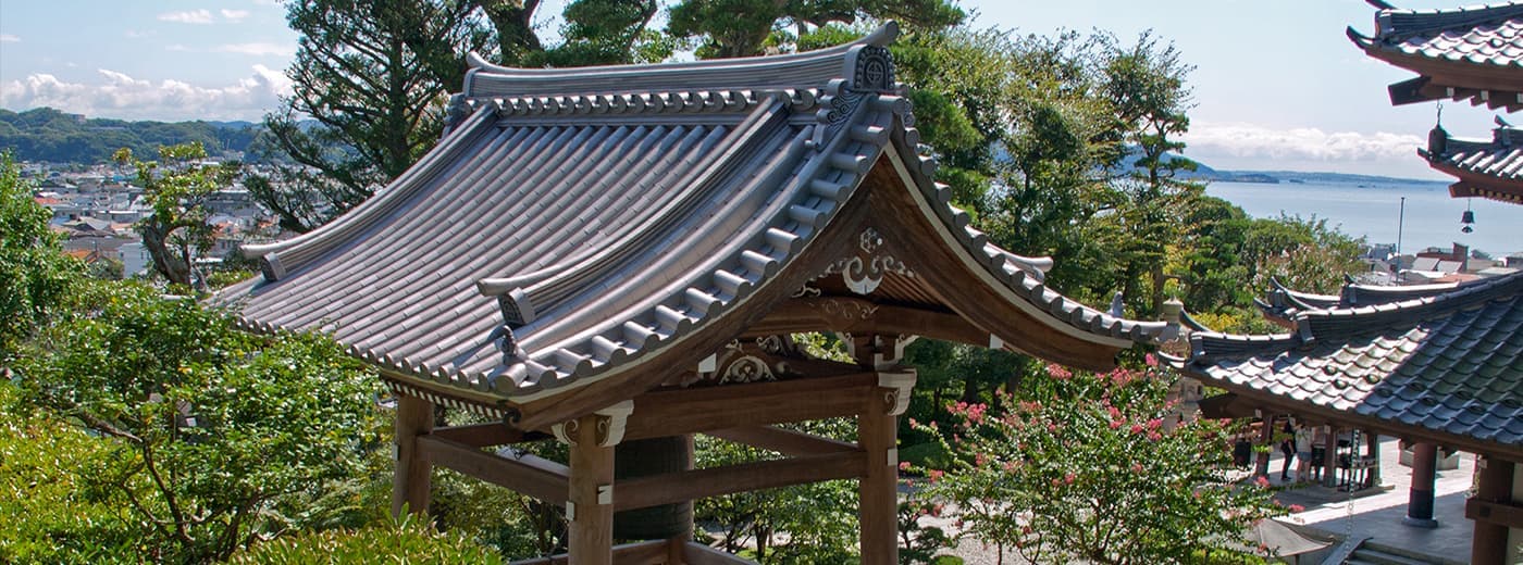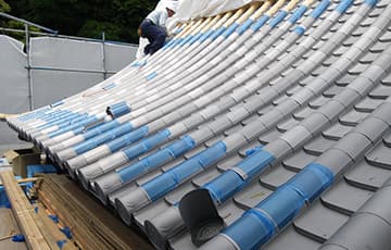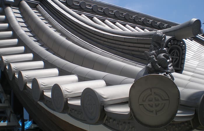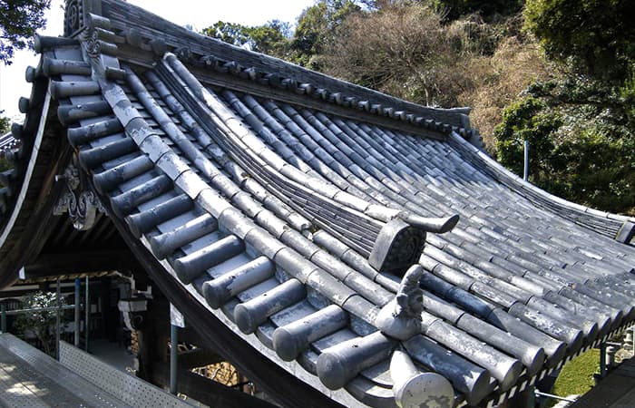 瓦の約1/13の軽さでの耐震性、さらに相模湾海岸から約500mに位置に立地するため潮風による塩害も考慮し、金属屋根のなかで比類無き耐候性を誇るチタン屋根「カナメ段付本瓦葺き」での工事となりました。