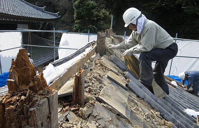地震時の被害が心配されていた瓦が全て降ろし終わった3日後に、東日本大震災の大地震に襲われました。瓦降ろしが終わっていたことで大きな被害がなく、5日後には御寺院様と協議の上、安全面に最大限の配慮をした上で工事を再開致しました。