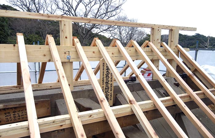 損傷がなく十分に強度を保っている柱は活かしながら、新たに棟下地を構築。