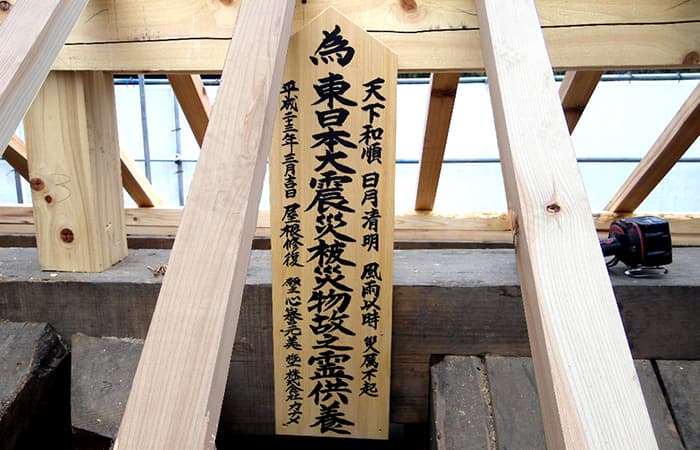 棟札には工事期間中に発生した東日本大震災への、御寺院様・弊社・関係者全員の強い祈りが込められました。