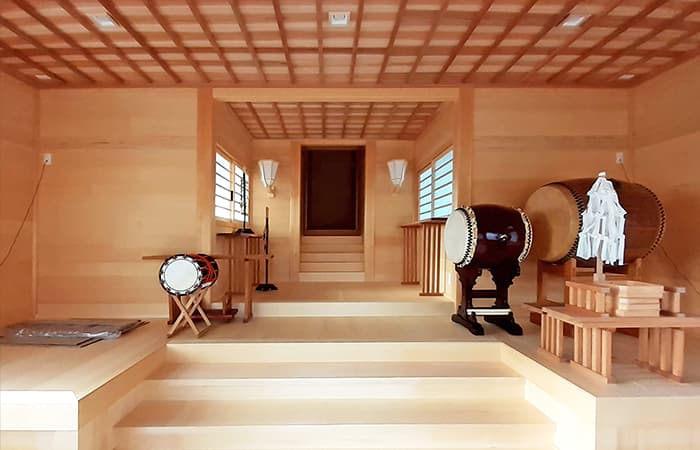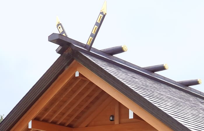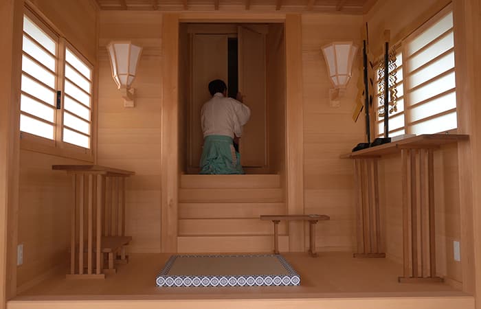 本殿の御扉(みとびら)は開閉時に「ギリ戸」というギギギィと音をだす構造にしています。音を鳴らす理由は「神様がお出ましになった」という合図であり、音が響き渡るように設計・施工をしております。