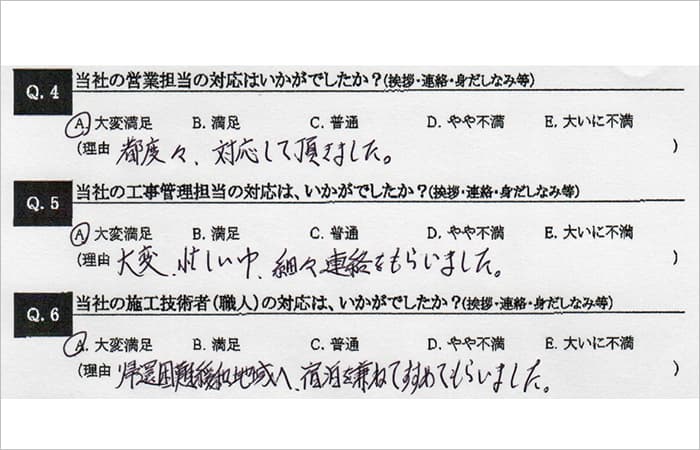 連絡やご報告を宮司様にこまめにさせていただきました。その結果、営業、工事管理、職人の対応について「大変満足」の評価をいただきました。