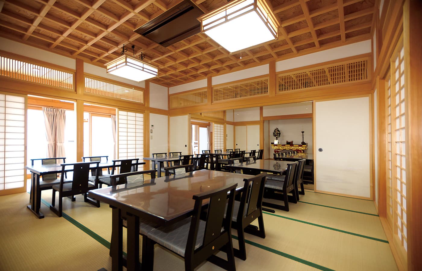 ご法事などお集まりいただいた皆様に落ち着いて過ごしてもらえるように明るく、広々とした空間をご提案致します。
